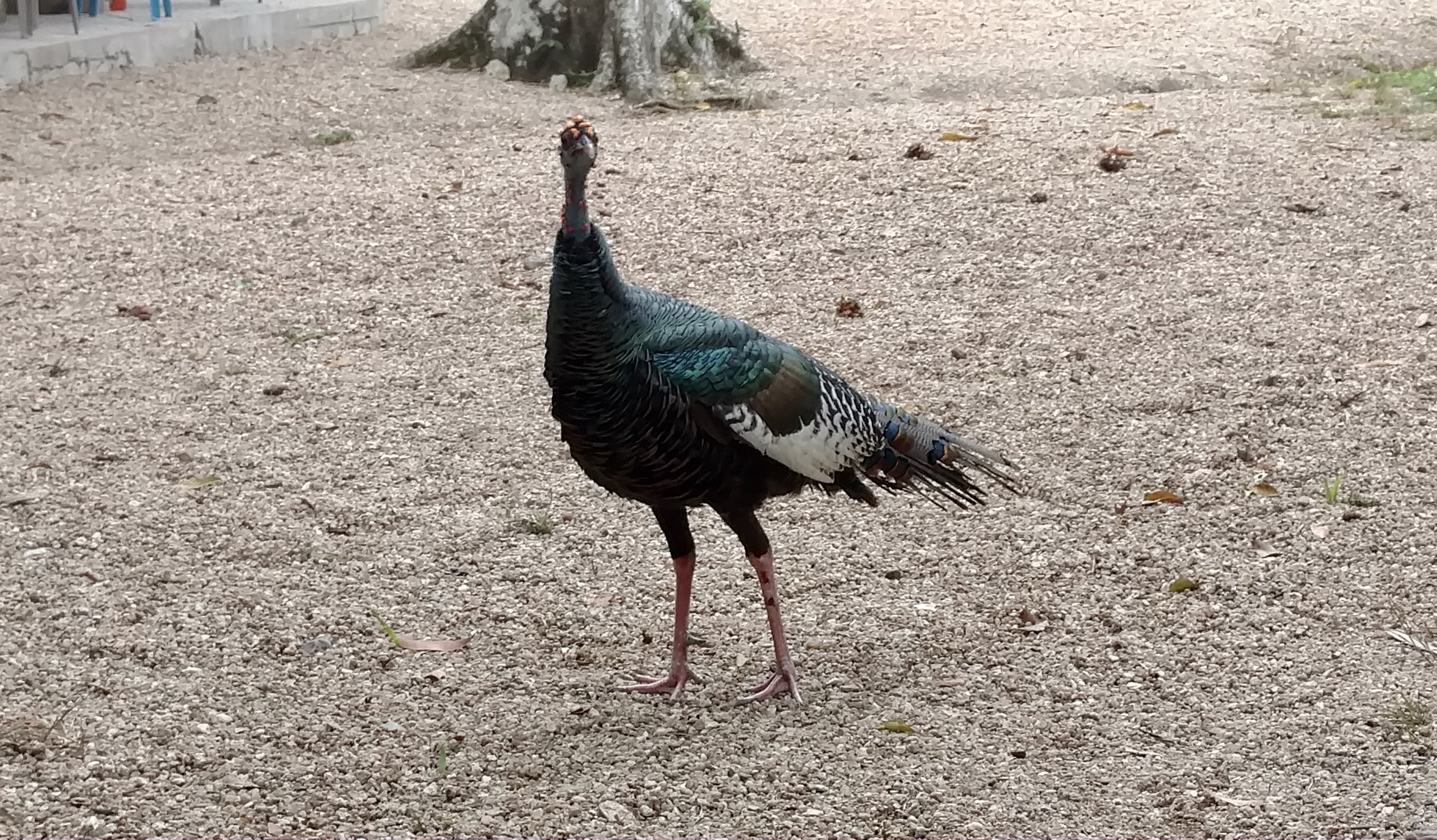 Pierre is an ocellated turkey (Meleagris ocellata) who has decided that only he is allowed to use the La Milpa entrance road. He has a habit of jumping in front of trucks and blocking their passage, as if challenging them to a fight. Sure enough, he did this to us. Our driver had to reverse and try to go around Pierre several times, but eventually he succeeded. When I looked back Pierre was chasing us.